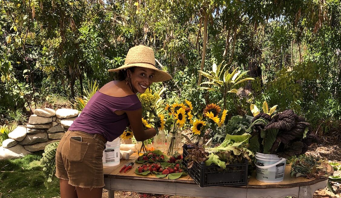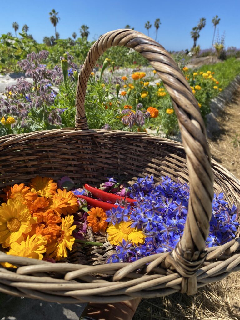 In the flower garden harvesting borage flowers for this week’s boxes and calendula flowers to dry for future goodies!